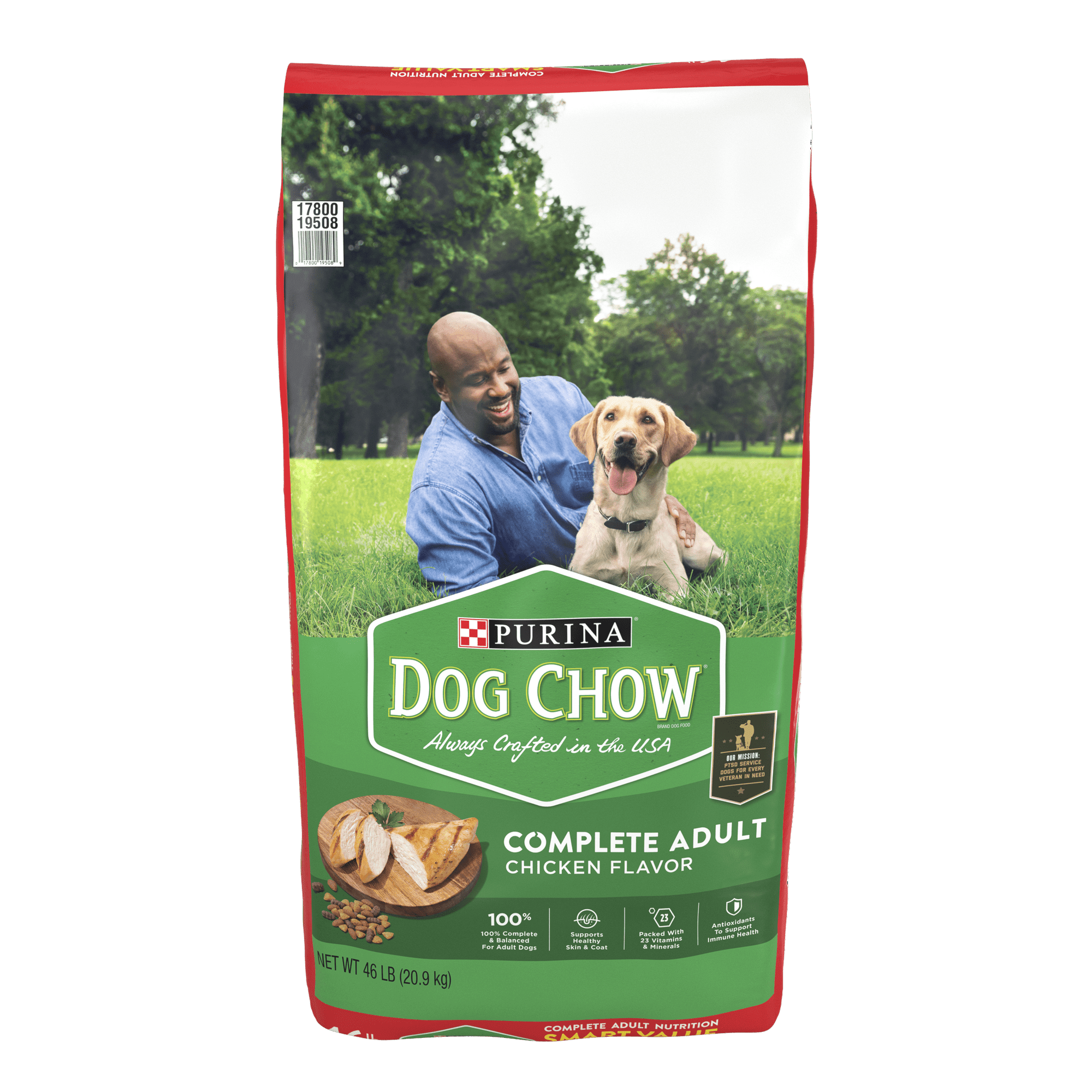 Discover a dog kibble that meets your dog's taste requirements while providing 100 percent complete and balanced nutrition with Purina Dog Chow Complete Adult Dry Dog Food With Chicken Flavor. An easily digestible dog food with a crunchy Purina dry dog food texture to help clean your dog’s teeth, this formula has a lot to like. Each Purina Dog Chow Complete dog food bag is packed with enough high-quality protein to support your dog’s strong muscles. That’s not all: this dog food delivers 23 vitamins and minerals along with plenty of antioxidants to bolster your dog’s immune system. A wholesome dry dog food with an irresistible chicken flavor, this Purina dog food dry kibble will give your loyal canine companion a tasty and fulfilling meal to look forward to. Plus, you can rest assured knowing that every bag of this Purina Dog Chow Complete Adult Dry Dog Food is rigorously tested for quality and safety in Purina-owned facilities. Helping dogs live their best lives should be simple. That’s why all Dog Chow dry and wet dog food recipes offer 100 percent complete and balanced nutrition for adult dogs. Purina Dog Chow Complete Adult Dog Food recipes give adult dogs the comprehensive, high-quality nutrition they need to help them live long and healthy lives.